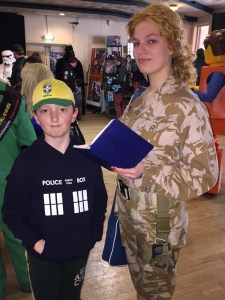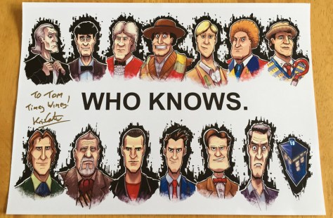After my Tug of War I explored the stalls and met Kris Carter, a comic book creator who colours titles such as Transformers and Doctor Who and also writes ‘Lou Scannon‘ which has been nominated for an Eagle Award. I bought a picture he had drawn of all the Doctors and the TARDIS captioned ‘Who Knows’. It is a really fun picture!