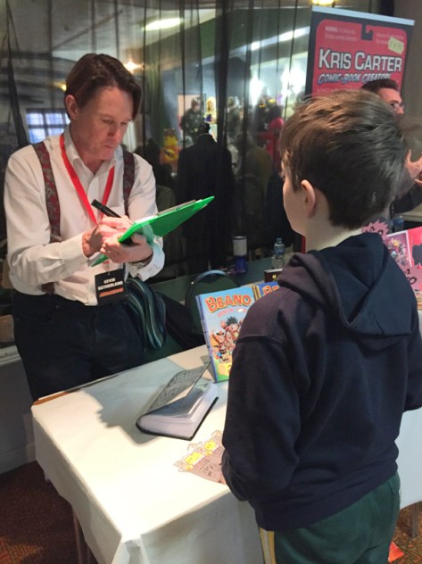 Next to Kris was Kev F Sutherland aka Kev F! I was very excited to meet Kev as he draws for my favourite comics The Beano and Doctor Who Adventures. I posed for a ‘Lightning Fast One Minute Caricature’ and it was great, I can’t believe I have been drawn by a Comic Book artist.